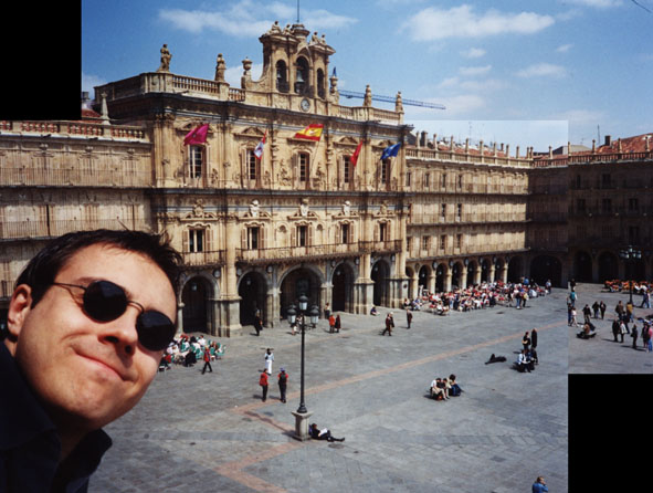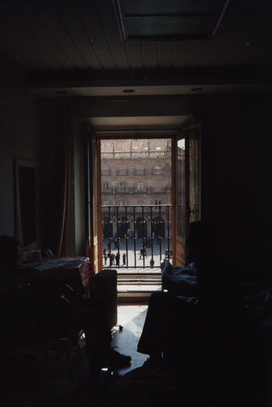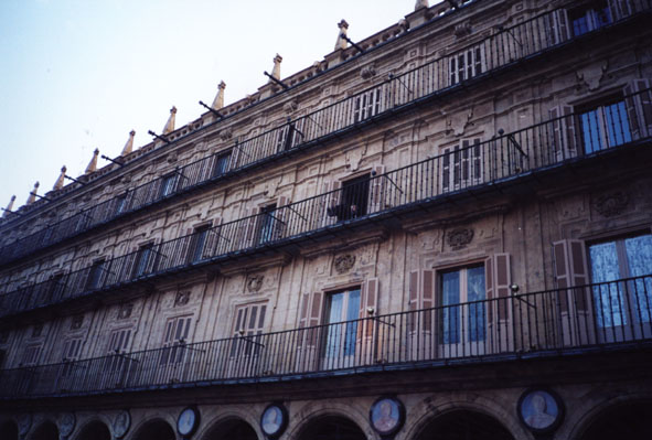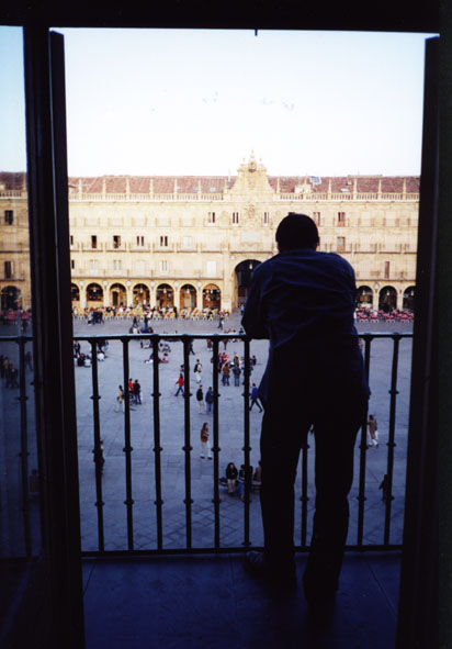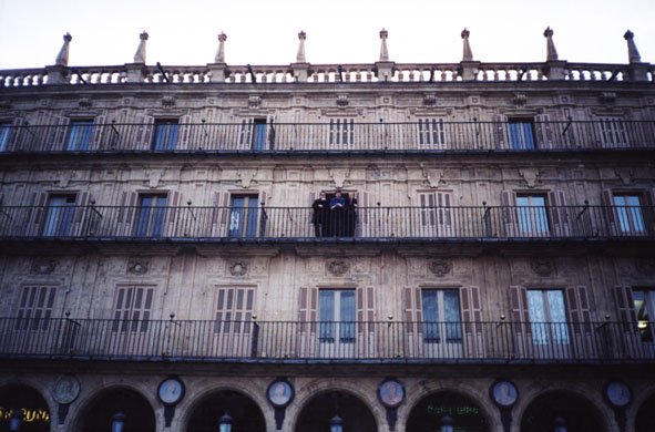 The Plaza Mayor (the main square) in Salamanca is one of the most beautiful ones in Spain. Other Plazas Mayores were modelled after the image of that square, also the one in Madrid. Due to Elisa we had the luck to have our accomodation directly at the Plaza Mayor. And if I write directly, I mean DIRECTLY. We had a balcony heading to the inside of the plaza. An amazing view. And now you ask yourself probably "Wow, they obviously had to pay a lot of money for the room..."´, and I say "If 13 € per person are a lot..."