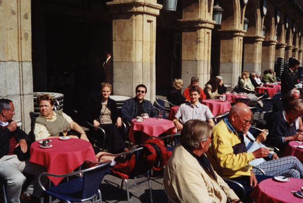 The morning coffee - Sandra, Tomasito and Alfons in the café directly in front of the hostal door.